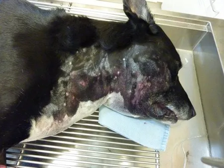 Here are 2 examples of patients who were bit by a rattlesnake. Luckily they were brought to the hospital for treatment right away. Every snake bite is different and we never know how much venom is deposited with a bite. The skin becomes necrotic and if left untreated, we have seen animals die a month after a bite. Middletown Animal Hospital carries Rattlesnake Vaccine that, when properly boostered, allows you to buy more time to get treatment and potential lessons the reaction. It is best to booster this vaccine right before "rattlesnake season" in the Spring.